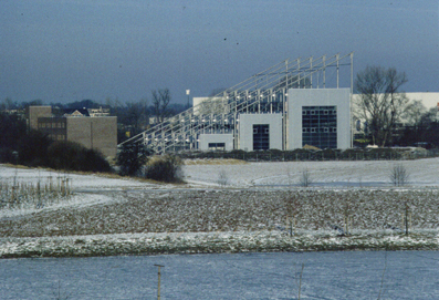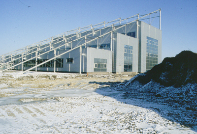 Ein Ensemble von 3 Hallen verschiedener Größe, innen miteinander verbunden. Das Bauwerk ist das erste an einem neuen Standort der Universität. Als ein Zeichen an diesem Ort und zur Minimierung des umbauten Raumes wurde ein auffallendes außen liegendes Tragwerk entwickelt. Haupttragwerk ist eine Stahlkonstruktion aus Rohren und Zugstäben, eine zusammenhängende Serie von unterspannten Trägern. Sie stützen jedes der 3 Dächer an 3 Stellen, beiderseits außen und einmal in der Mitte. So wird jede Dachfläche nur im First durchstoßen. Das außen liegende Tragwerk wird von den innen liegenden Teilen der Konstruktion sorgfältig thermisch getrennt. Die größte Höhe beträgt 26 m. Horizontale Kräfte werden in Hallenlängsrichtung durch Verbände an geeigneten Stellen aufgenommen, in Querrichtung durch die Obergurte, die über dem als Garten gestalteten Bereich zwischen Hallenensemble und Institutsgebäude in die Fundamente laufen. Das Institutsgebäude ist ein schlichter Mauerwerksbau mit Stahlbeton-Flachdecken. |